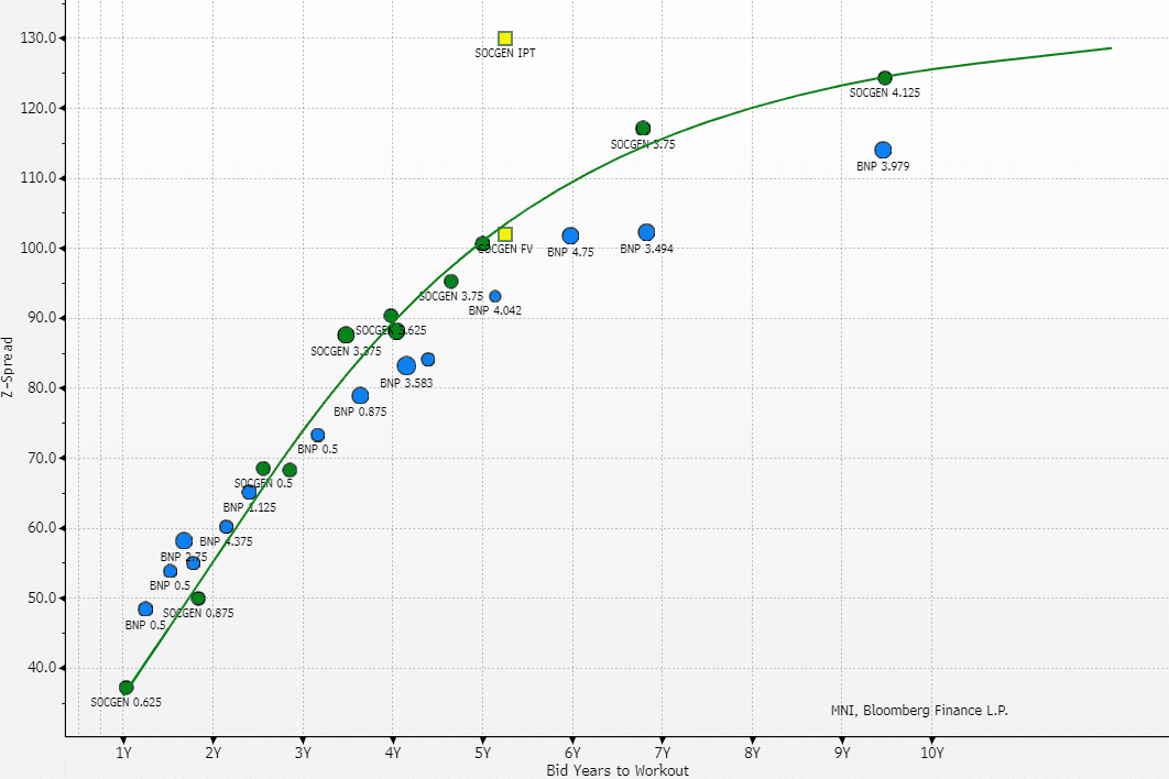 • FV: MS+102 - slightly inside the drawn curve. Several SOCGEN bonds in the belly of the curve trade over par. The SOCGEN 4.875% 2031 is trading at 106px.