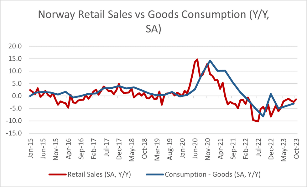 Norway SA retail sales for October rose +0.6% M/M (vs. -0.3% prior). The three economists that formed the bbg consensus had expected a -0.2% M/M print. Today's data provides further evidence that the retail sales index is re-aligning with pre-covid trends, as the process of rebalancing the economy back to services persists and we continue to move away from the pandemic-induced increase in goods consumption.