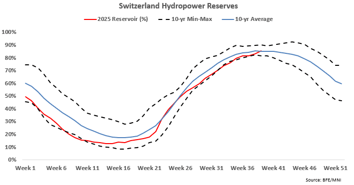 The latest Swiss hydro balance is forecast to end this week at 45GWh. The balance is forecast to narrow to 443GWh as of 15 October.