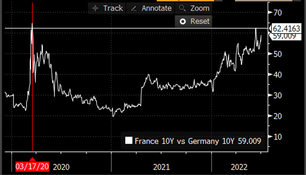 OAT/Bund trades 3.1bps wider and widest since mid June, and targets 60.00bps.