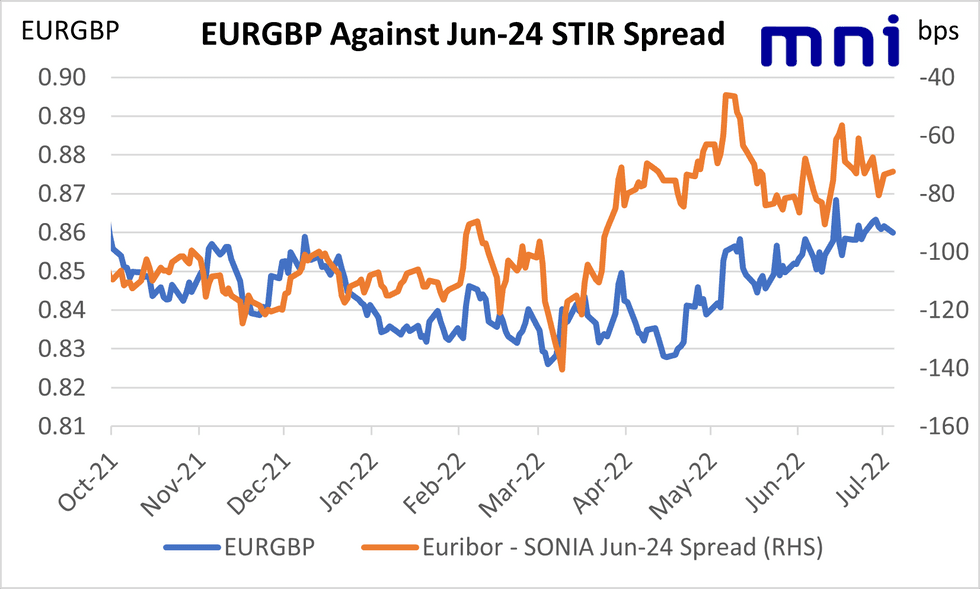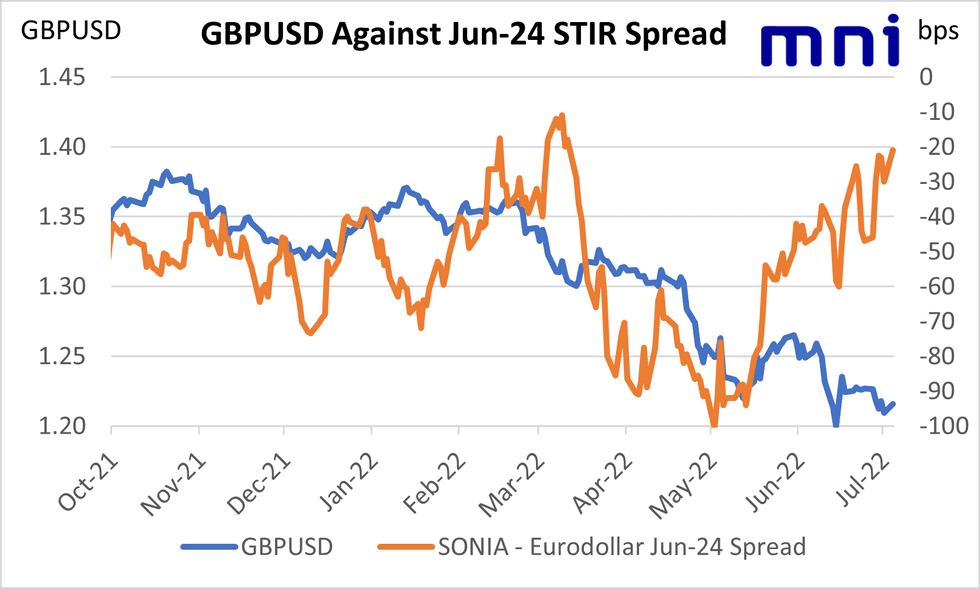 First and most obvious is that US STIR markets are driving UK STIR markets - and FX traders don't actually believe the hikes priced into the SONIA strip (which is roughly looking for Bank Rate at 2.50% in 2-years time with hikes to around 2.9% by the February 2023 meeting and then cuts).