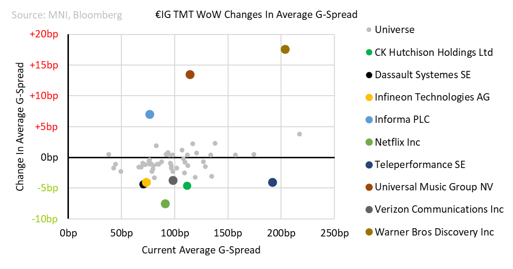 - Informa bonds underperformed, despite a strong Q2 with multiple guidance raises, on the news of a GBP1.2bn cash offer for Ascential that will see leverage move from 1.6x to the upper end of the 1.5-2.5x range, though both S&P and Fitch have indicated that ratings will be unchanged on the expectation that the increase in leverage will be temporary; https://marketnews.com/informa-reports-strong-h1-with-guidance-raise-announces-ascential-cash-offer.