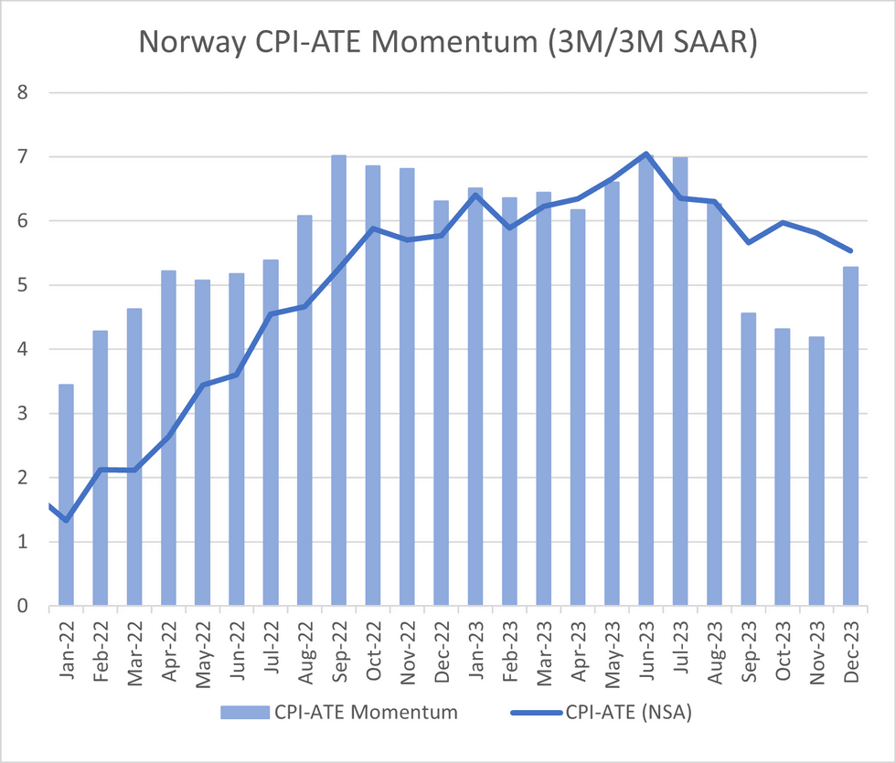While the monthly and annual figures in the December CPI report were softer than expected, the seasonally adjusted series indicated relatively firmer price pressures. SA CPI rose +0.46% M/M (vs +0.61% prior) while SA CPI-ATE rose +0.31% M/M for the second consecutive month. Both run-rates are above the Norges Bank's 2% target when annualised.
