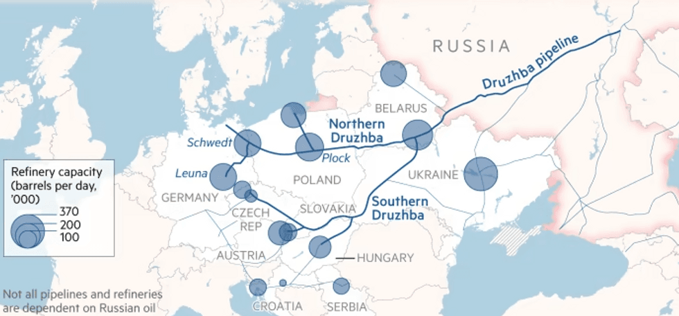 Russia's state-run TASS reporting comments from oil network operator Transneft stating that a section of the Druzhba oil pipeline in Ukraine has been suspended, but that the pumping of oil from Belarus to Ukraine is continuing.