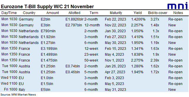 The EU and Italy both still look to issue bills this week while Germany, the Netherlands, France and Austria have come to the market already. We look for issuance of E25.1bln at first round operations, up from E14.1bln last week.