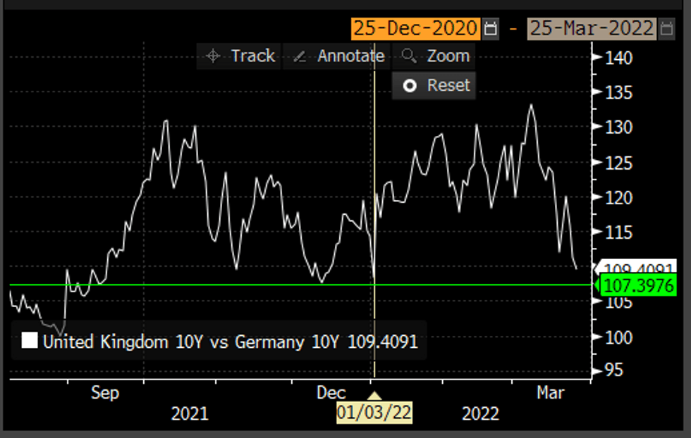 European equities are up sharply as Russia-Ukraine risks are seen easing, with cyclical stocks outperforming and energy underperforming. German Dax up 190.54 pts or +1.3% at 14693, FTSE 100 up 44.44 pts or +0.59% at 7494.21, CAC 40 up 107.67 pts or +1.59% at 6787.6 and Euro Stoxx 50 up 64.6 pts or +1.62% at 3985.47.