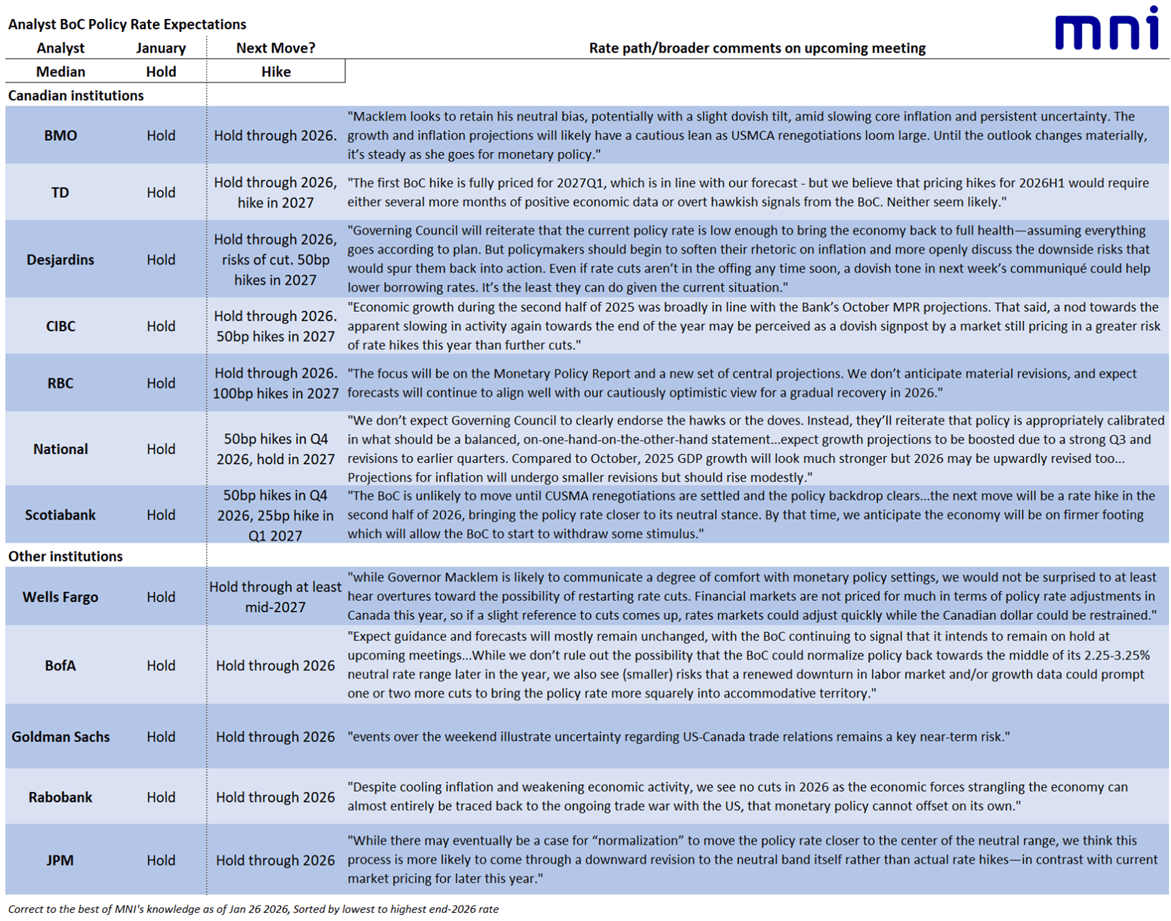 The Bank of Canada is overwhelmingly expected by both markets and analysts to maintain its overnight rate at 2.25% for a 2nd consecutive time at its January meeting (announcement at 0945ET), as we explain in our preview (link). Markets go into the meeting implying a slight bias toward a cut by mid-year (~8-9bp cumulative easing through July), but rates actually ending the year higher (by about 10bp vs current levels).