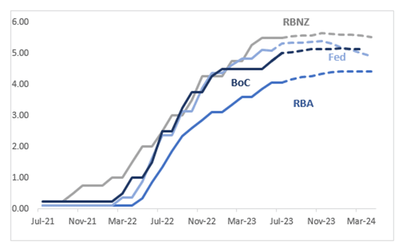 The US market is currently indicating a 33bp easing by the end of March 2024 from a 5.37% terminal rate, while the other $-bloc markets show almost no chance of easing.