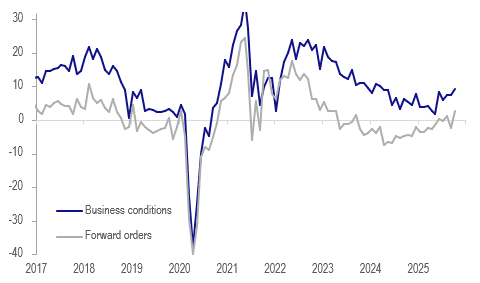 NAB business confidence and conditions were little changed in October with the former down 1 point to +6 and the latter up 1 point to +9. The survey details were generally positive though with forward orders positive and their highest in two and a half years, investment up, labour demand steady and cost/price increases moderating. It is consistent with an ongoing economic recovery and contained inflation and therefore the RBA on hold.