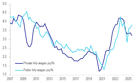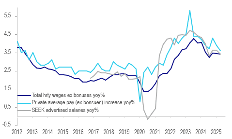 Q3 wages rose 0.8% q/q to be 3.4% higher on a year ago, in line with Q2 and Bloomberg consensus, signalling a stabilisation consistent with SEEK advertised salary data. In November, the RBA forecast 3.4% y/y for Q4 2025 before moderating to 3% by end 2026. Thus, the Q3 WPI data don’t change the outlook for monetary policy with rates likely on hold towards at least mid-2026 as it monitors price and capacity pressures.