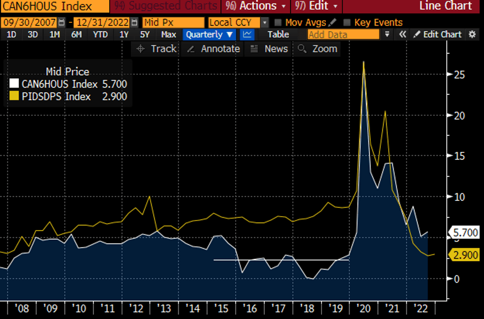 Canada household savings rate (white) vs US equivalent (yellow)Source: Bloomberg