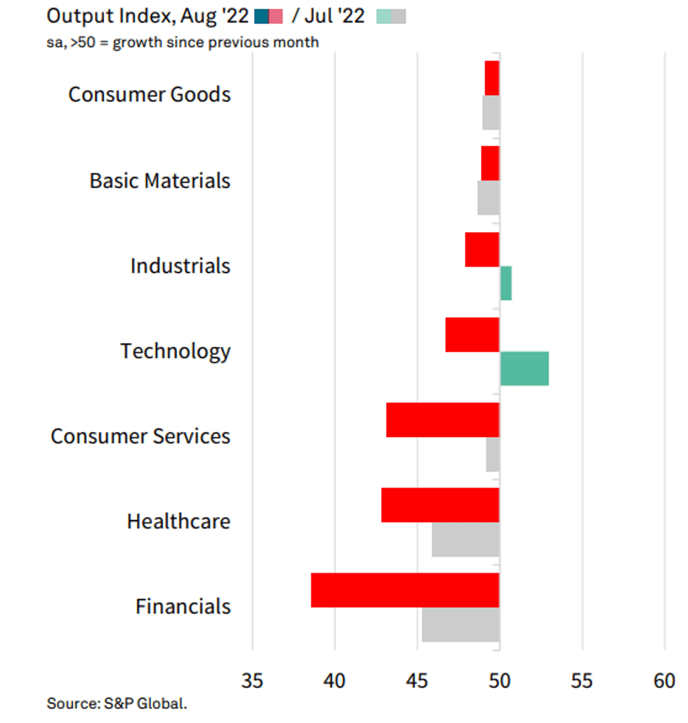 Some notable weakness across multiple sectors across the manufacturing and service sectors pointed out by August's S&P Global US Sector PMI release: