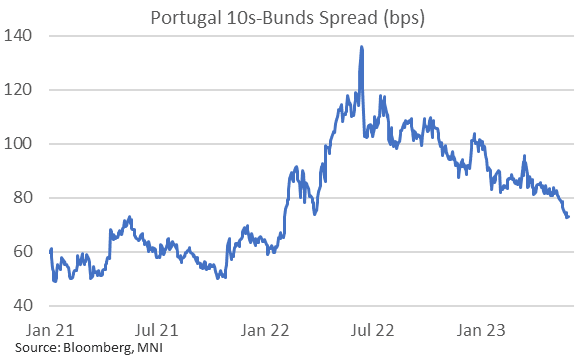 - It also sees the Portugal-Bunds spread back at Friday’s close of 73bps for lows since Feb 2022, having briefly pushed even lower still.