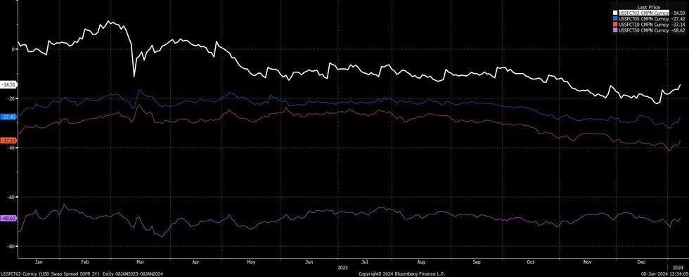 - Flows surrounding a brisk, albeit not record breaking, start to ’24 IG issuance will have also filtered into swap spread activity during the early rounds of ’24 swap spread dealing.