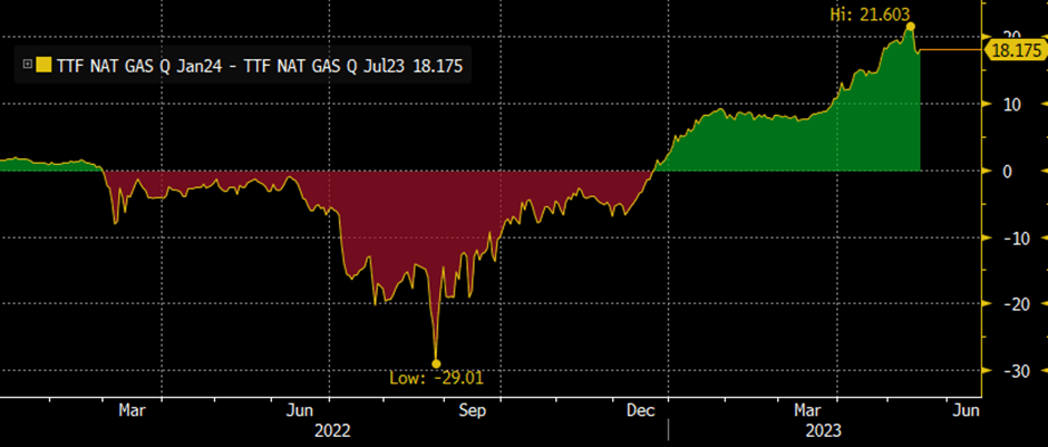 The TTF gas premium of Q1 2024 over Q3 2023 has narrowed by over 4€/MWh in the last week as falling summer natural gas prices and steady European storage injections have started bringing winter forwards lower.