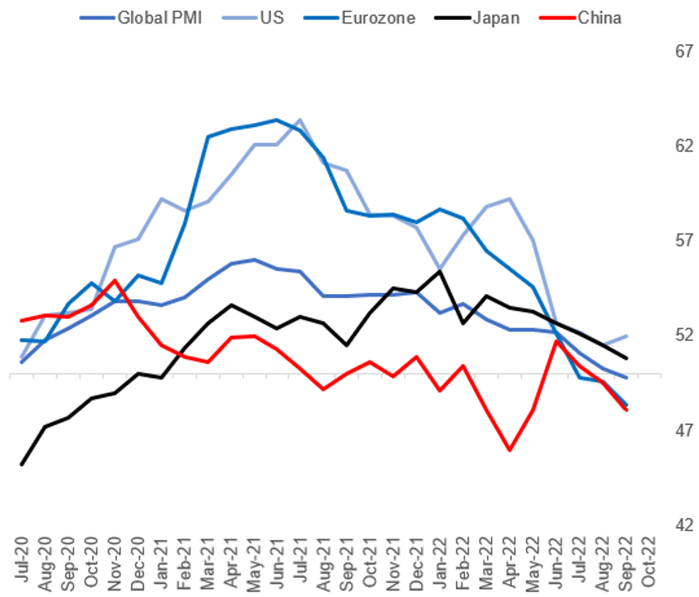 Global manufacturing activity slipped into contraction in September, with the JPM Global PMI falling to 49.8 - the first sub-50 reading since June 2020. The sub-categories showed a continued contraction in new orders, production, and backlogs, and falling international trade.