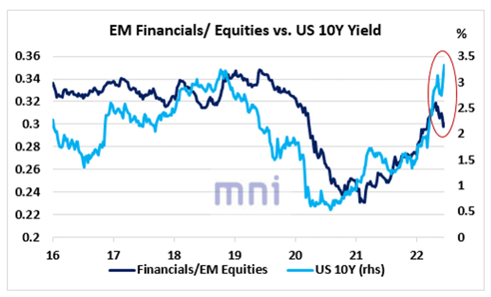 The significant liquidity injections following the Covid shock combined with the surge in ST and LT bond yields had been a strong driver of EM financial stocks until the Ukraine invasion.