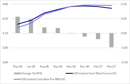 Following yesterday’s RBA policy decision, RBA-dated OIS pricing is 5bps firmer to 5bps softer across meetings.