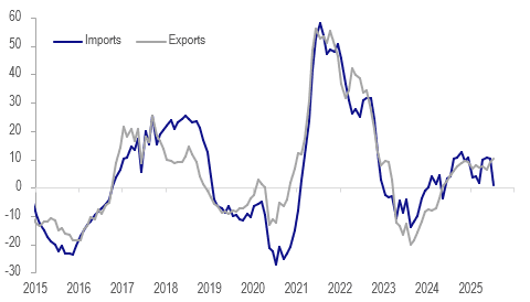 Indonesia merchandise exports vs imports y/y% 3-mth ma